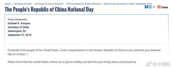 [美国国务卿蓬佩奥祝贺中国国庆:中国人民节日快乐]在中华人民共和国即将迎来建国六十九周年之际,当地时间9月27日,美国国务卿迈克·蓬佩奥送来祝福。美国国务院网站刊登了蓬佩奥发表的声明。