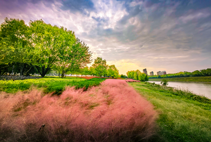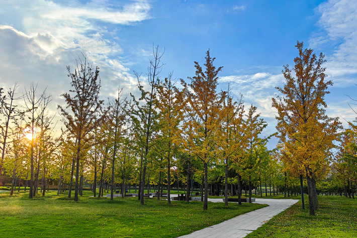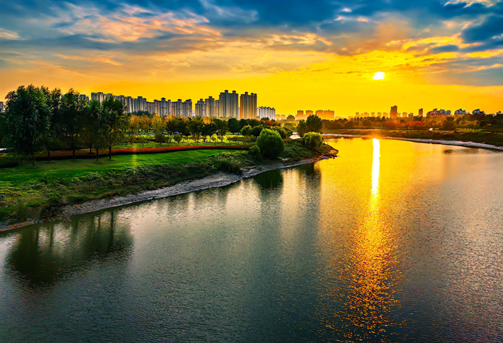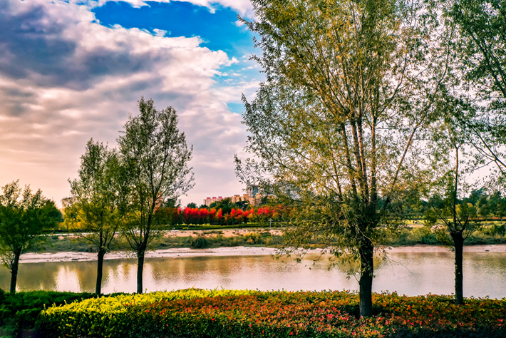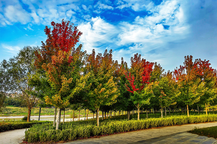 2025年10月10日,河南省驻马店市遂平县汝河公园,一河碧水与两岸色彩斑斓的树木相映成景,处处都被秋色浸染,锦绣交织,风景秀美。图为秋色漫染。赵建明 摄