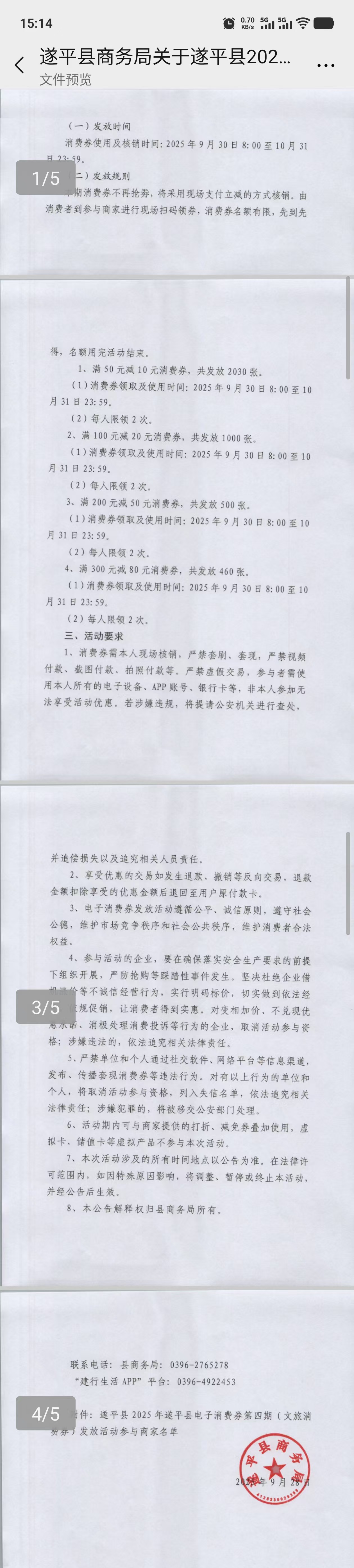 为进一步贯彻落实省委、省政府和市委、市政府促消费、扩内需有关决策部署,经县委、县政府研究同意,决定在全县通过“建行生活APP”平台组织开展遂平县2025年电子消费券第四期(文旅消费券)发放活动,现就有关事项公告如下:一、消费券投放类别本期发放3990张零售文旅消