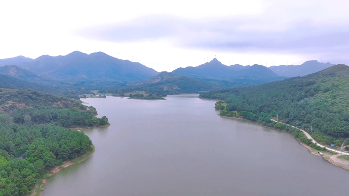 2024年9月11日,无人机航拍视角下,嵖岈山镇魏楼水库,平静幽蓝的水面与四周秀美山川、葱郁林草,构成一幅绚丽灵动的画卷。记者: