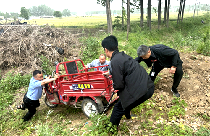 5月11日上午,市场监管局餐饮二队王洪涛、于君君、张阳、张景明四名执法人员在石寨铺镇执法活动返回途中,遇到一位老人骑三轮车掉到路边沟里,他们四人立即下车帮老人把三轮车拉上路,看到自己的三轮车被成功拉出来,老人连声向大家表示感谢。11日上午十点二十左右,王洪