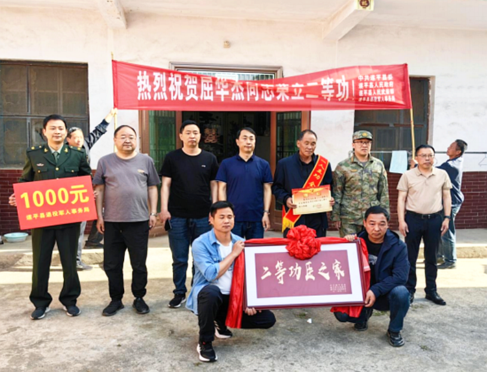 4月24日上午,伴随着欢天喜地的锣鼓声,县人武部政委罗志军、县政府副县长冯浩、县退役军人事务局局长殷耀林、文城乡党委书记刘海洋等军地领导将立功喜报、“二等功臣之家”牌匾和奖励金送到现役军人屈华杰家中,让功臣模范和军人家属共享尊崇荣光!“军营建功勋,家乡扬