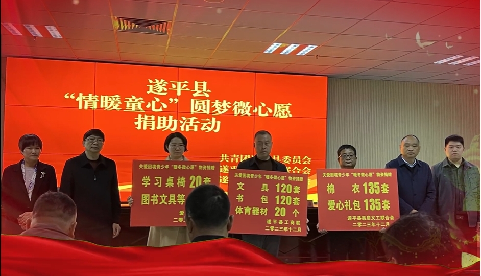 近日,共青团遂平县委组织召开“情暖童心”暖冬微心愿物资捐赠仪式,县委统战部、县工商联、吴房义工等单位相关领导及社会爱心人士代表参加,现场完成前期认领的255个暖冬微心愿相关物资捐赠。隆冬将至,为扎实践行“四下基层”工作机制,推动主题教育走深走实,共青团遂