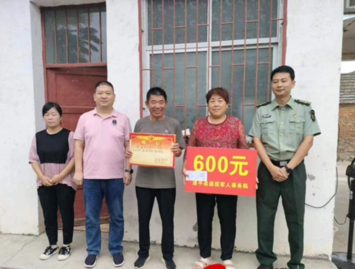 为进一步弘扬拥军优属的光荣传统,营造“一人参军,全家光荣,一人立功,全家荣耀”的浓厚氛围,2023年7月19日上午,遂平县退役军人事务局副局长杨辉、遂平县文城乡武装部部长宋旭升等一行来到王来宾村,为在部队荣立三等功徐鑫家属送上立功喜报和慰问金。得知儿子在部队