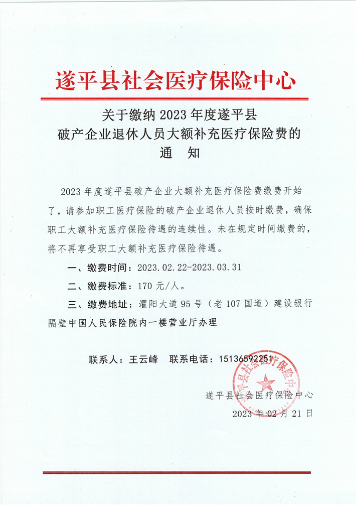 关于缴纳2023年度遂平县破产企业退休人员大额补充医疗保险费的通知