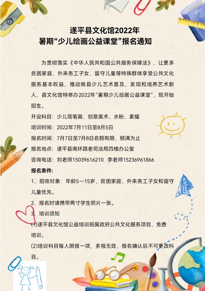 遂平县文化馆2022年暑期“少儿绘画公益课堂”报名通知