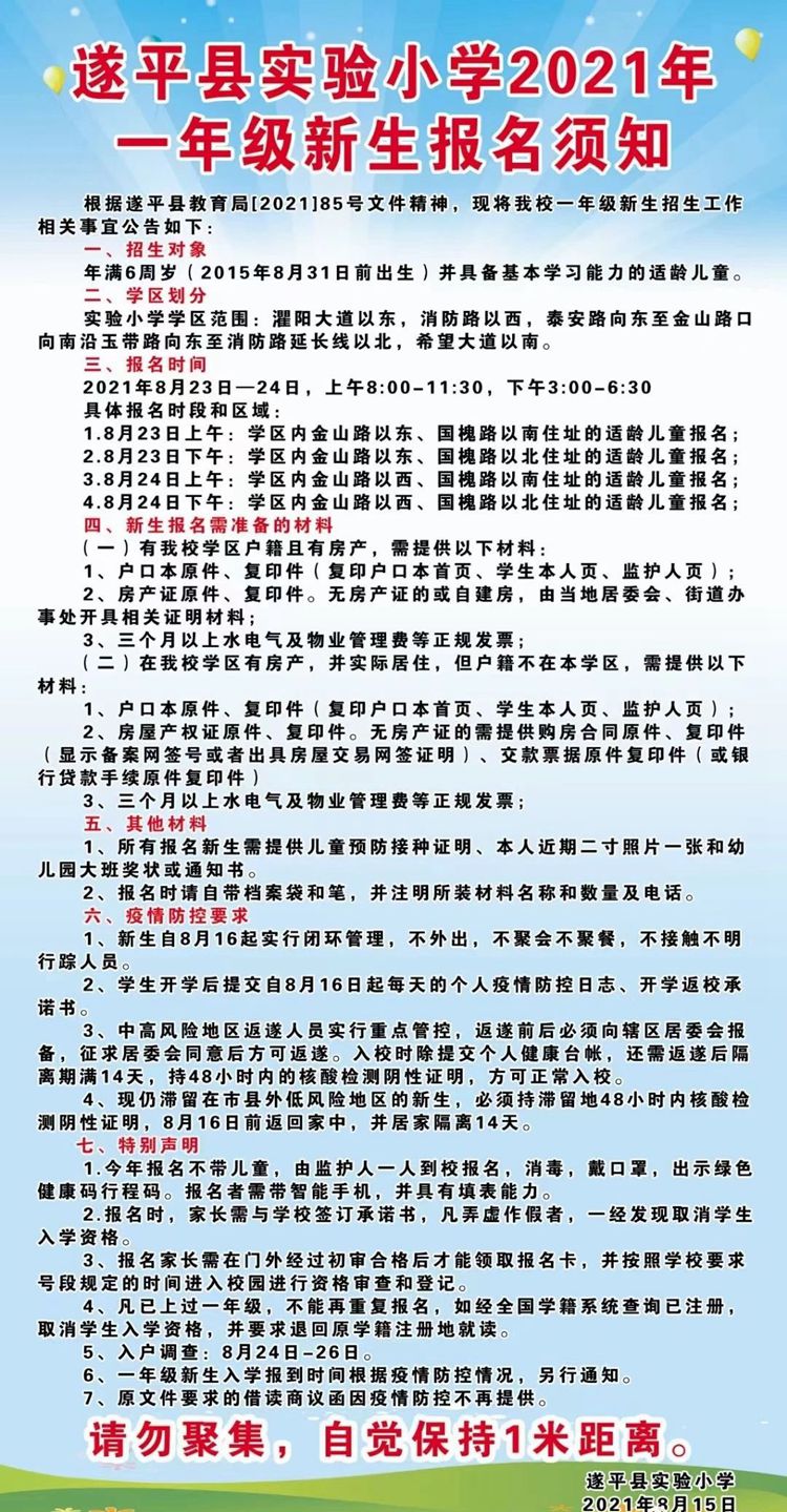 遂平县实验小学2021年一年级新生报名须知