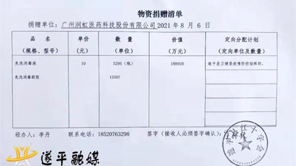 “喂!您好!你是遂平县红十字会的李会长吗?我是广州润虹科技股份有限公司的司机徐海松,我们董事长车七石让我送的抗疫物资已经到你们红十字会院内了,麻烦您接收一下!” 8月7日晚10点,县红十字会会长李九州接到广州润虹科技股份有限公司的司机徐海松的电话,并