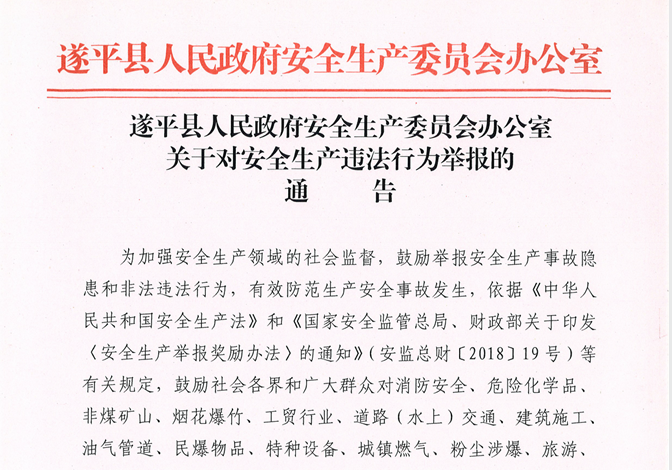 遂平县人民政府安全生产委员会办公室关于对安全生产违法行为举报的通告
