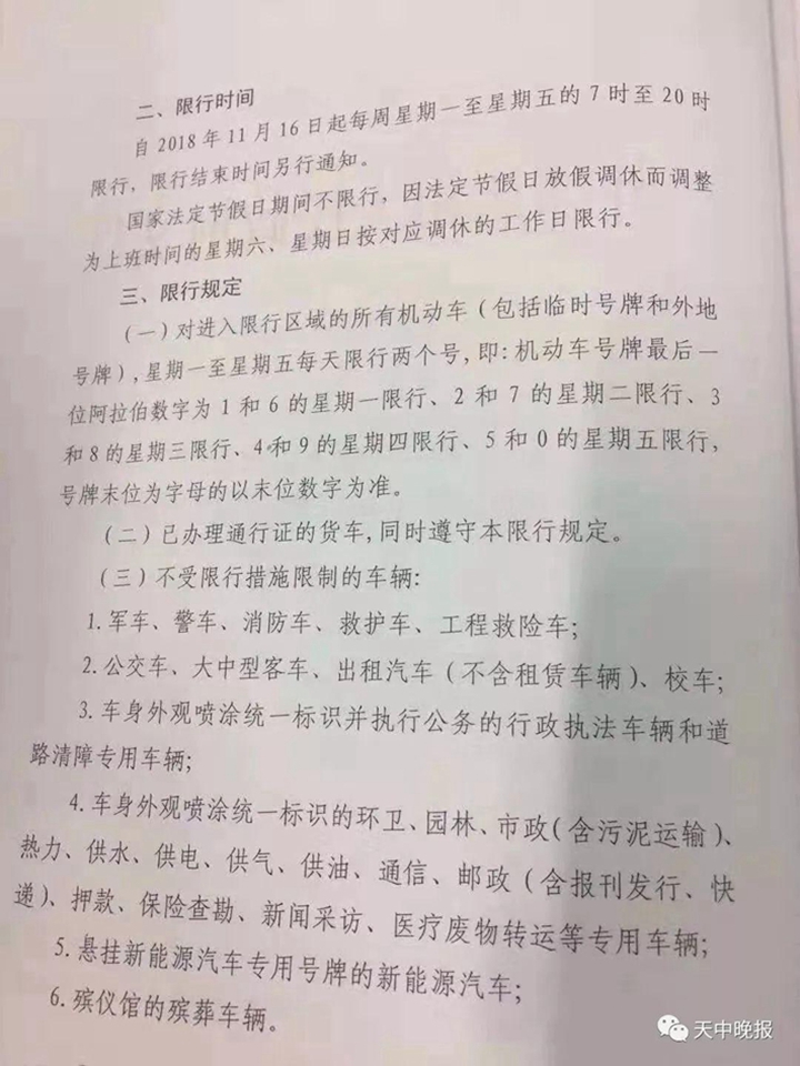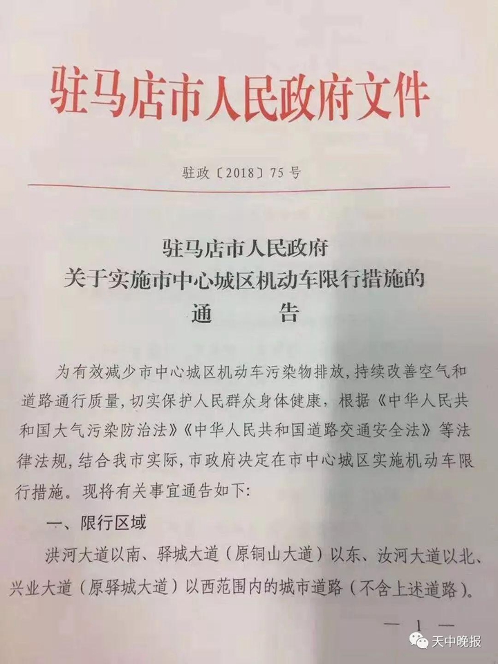 《驻马店人民政府关于市中心机动车限行政策的通告》已于11月12日下发,规定从11月16日起(法定节假日除外),周一至周五7时-20时限行,限行结束时间另行通知。