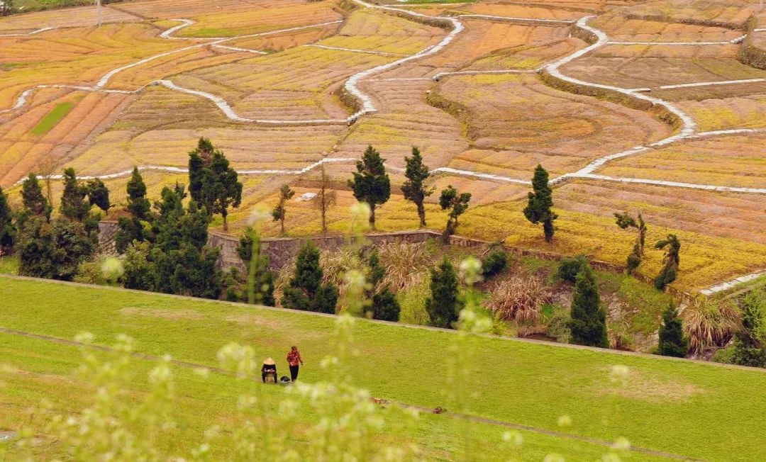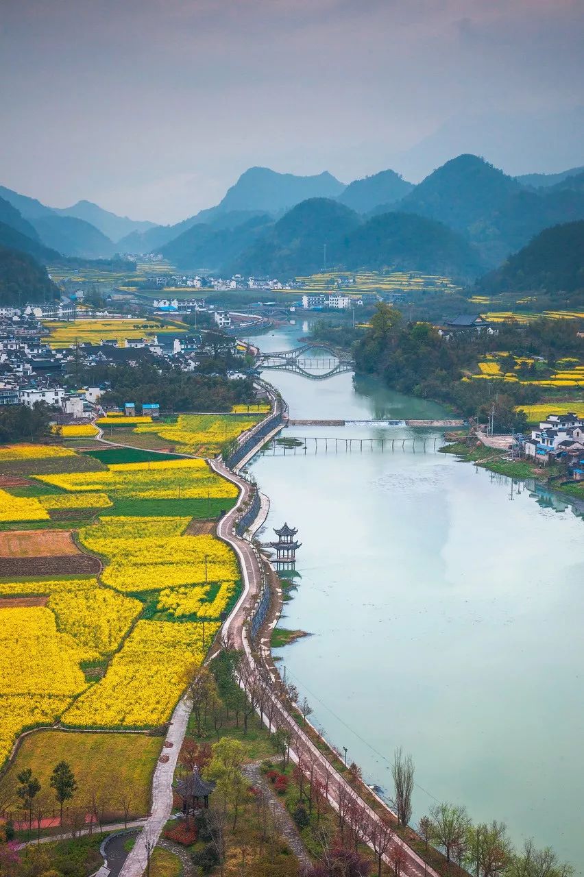 春天的绩溪,大片大片的油菜花海围绕着古色古香的徽派建筑,一派诗情画意。