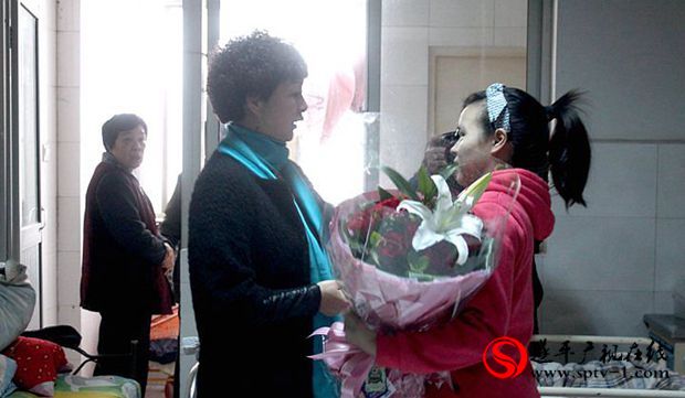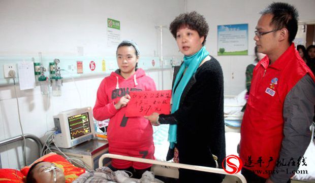 今天下午,驻马店市兆鱼积分宝网络科技有限公司旗下的积分宝公益联合会一行几人,在总经理黄家杰和会长邢爱的带领下,来到遂平县人民医院,亓亚红的母亲和二姐所在的病房,送去花篮、慰问品和5370元捐款。