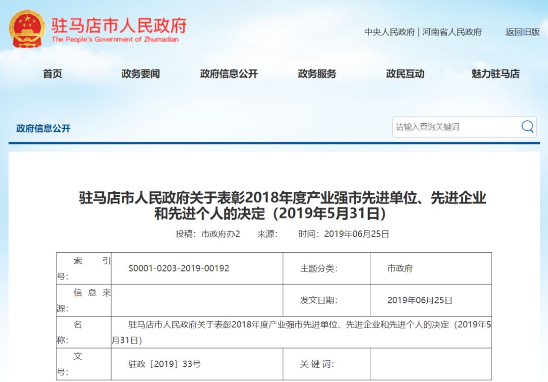 驻马店市人民政府关于表彰2018年度