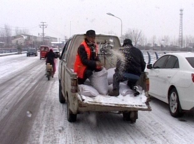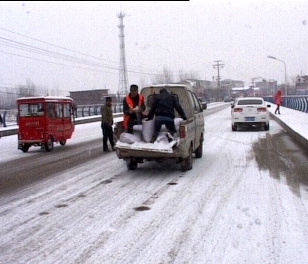 遂平县环卫大队大队长李锋告诉记者:近两日的降雪,造成部分路面桥梁积雪过多,为保障市民出行安全,缓解路面积雪过厚,遂平县环卫大队组织人员对城区路段、桥梁进行抛洒工业用盐,通过路面积雪消融,大大降低了交通事故的发生。