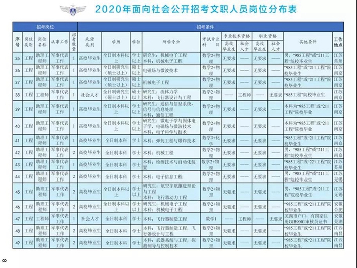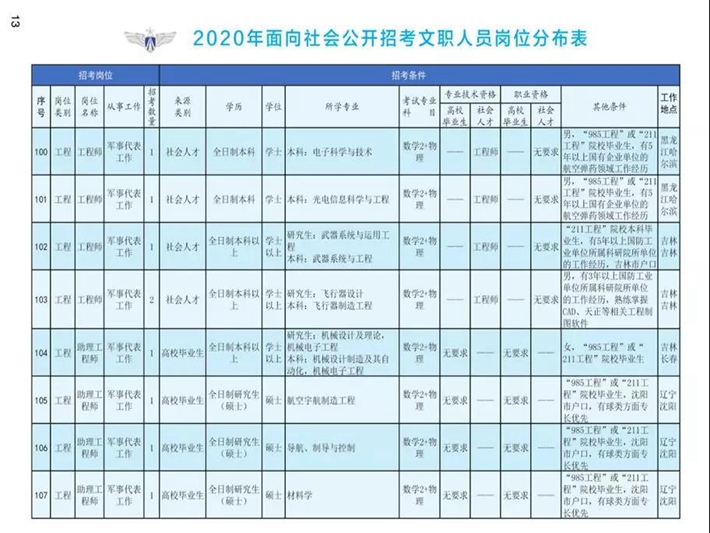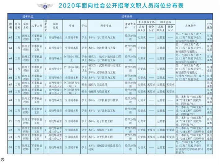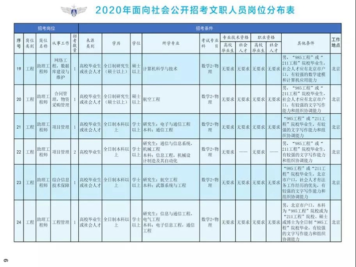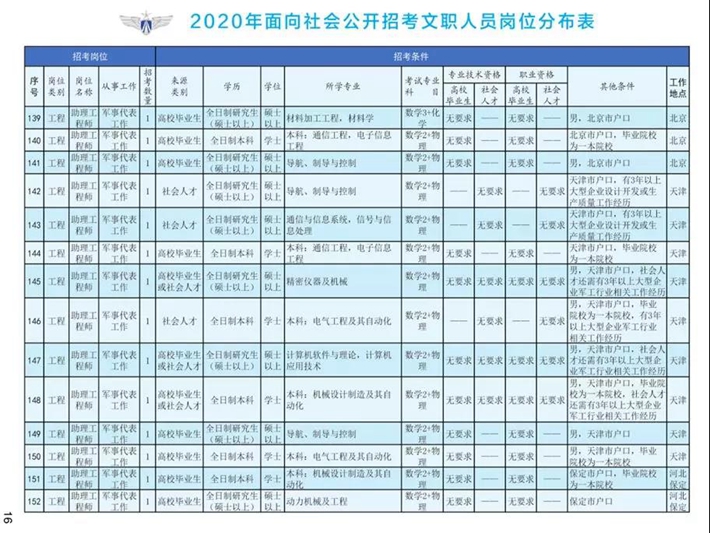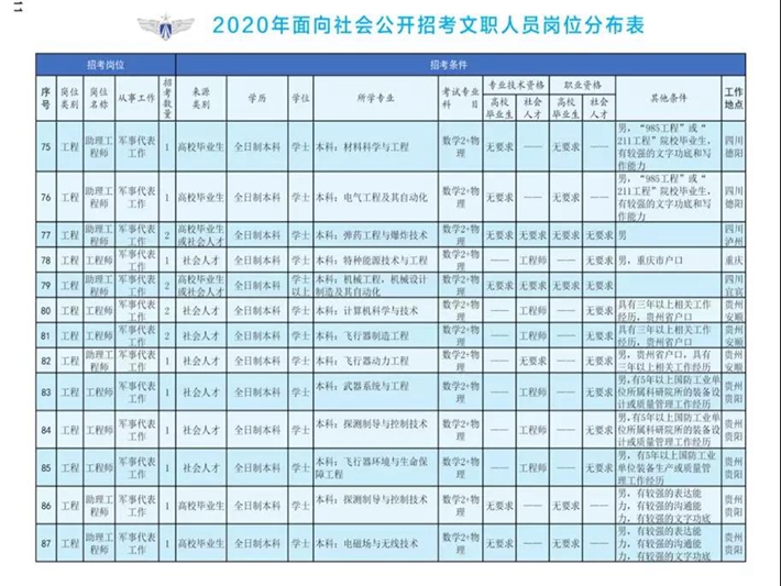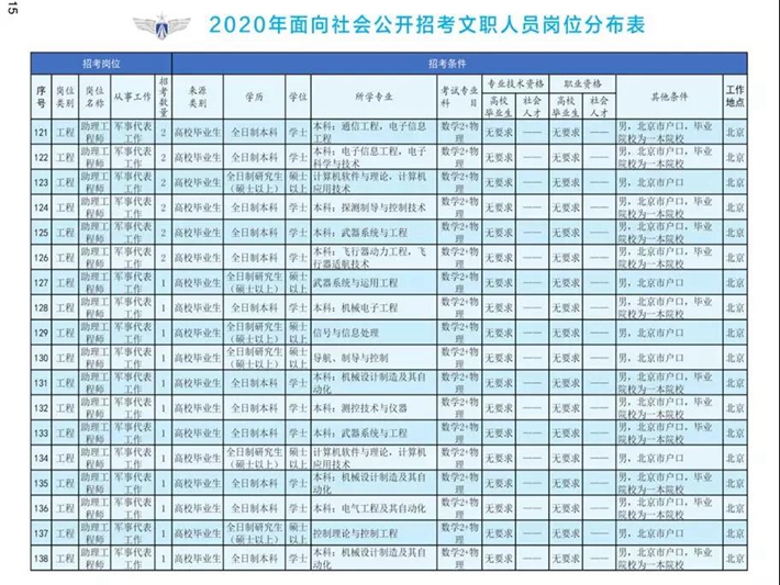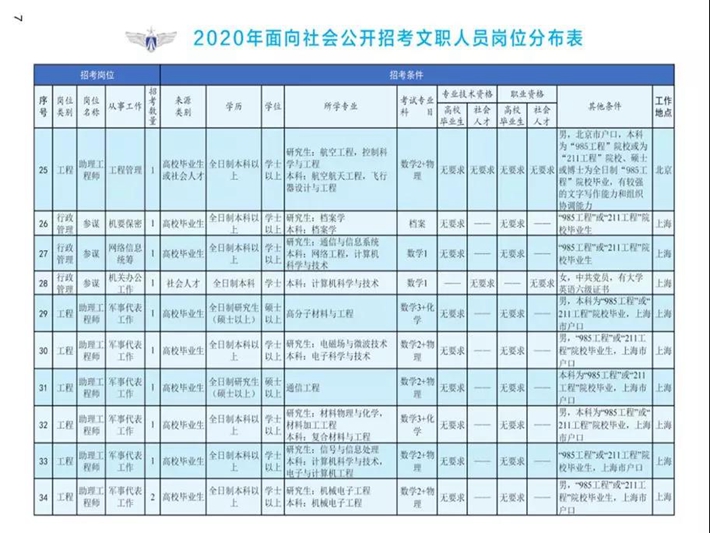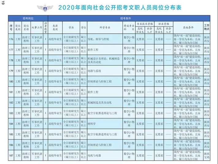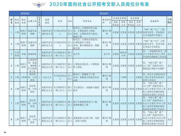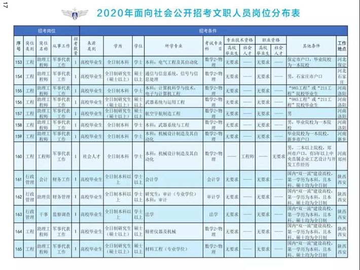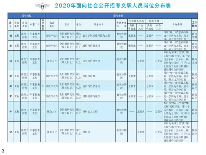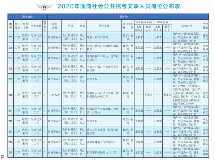 2020年空军装备部面向社会公开招考行政管理和专业技术人才,共215个岗位249人。具体岗位需求见附表《2020年面向社会公开招考文职人员岗位分布表》。