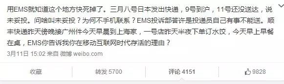 “EMS你告诉我你在移动互联网时代存活的理由?”女作家六六的一条微博,再次将EMS推到风口浪尖。今年以来,有关EMS投诉微博已有9万多条。段子手有云:朋友家孩子满月,我用EMS给孩子快递了一份礼物。收到快递后,孩子高兴地打电话对我说:“谢谢您的礼物,我非常喜欢。”