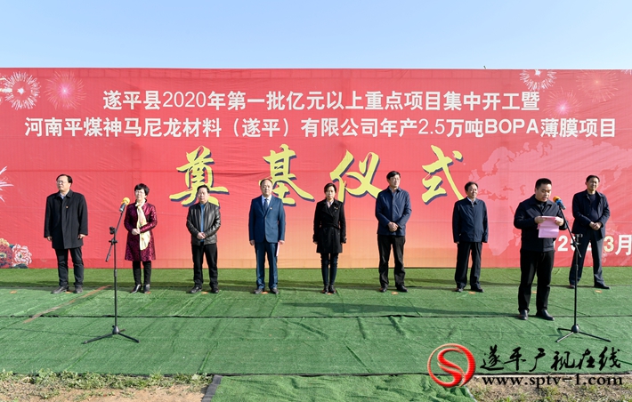 县委副书记、县长侯蕴在仪式上致辞,他说,遂平县2020年第一批亿元以上重点项目集中开工暨河南平煤神马尼龙材料(遂平)有限公司年产2.5万吨BOPA薄膜项目开工,这是我县坚决贯彻落实中央和省、市关于复工复产部署的务实行动,是落实中央“六稳”要求的具体举措,对于圆满完成全年目标任务、推动经济平稳健康发展具有十分重要的意义。当前,我县正处在疫情防控的关键期、经济社会发展的快速恢复期。此次我们集中开工15个项目,涉及工业、农业、基础建设等方面,总投资98.2亿元,数量多、结构优、效益好,特别是平煤神马集团年产2.5万吨BOPA薄膜项目代表的尼龙产业,是全省重点培育的十大新兴产业之一,必将为我县产业发展注入新的动力,为推动经济高质量发展提供有力支撑。全县各级各部门要以这次集中开工为动员令,以时不我待、只争朝夕的责任感和紧迫感,尽心尽力帮扶企业,尽职尽责服务项目,确保“周周有进展,月月有变化”,跑出项目建设“遂平加速度”。施工单位要严把疫情防控关、质量安全关、建设进度关,以项目建设的实际成效,为如期全面建成小康社会夯实基础、作出贡献。