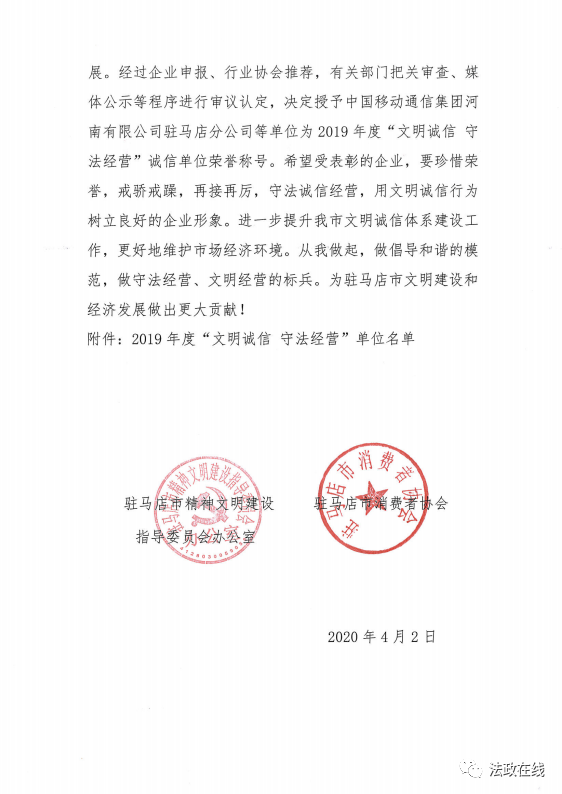 中国移动通信集团河南有限公司驻马店分公司城区销售服务中心