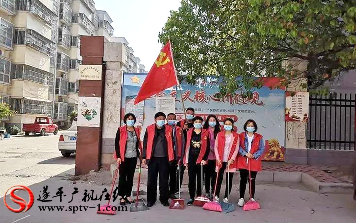 前进、泰安社区党支部组织党员干部肩扛党旗、佩戴党徽、手拿扫帚铁锹,不怕脏不怕累,打扫背街小巷、卫生死角,清洁社区环境,共建美好家园。