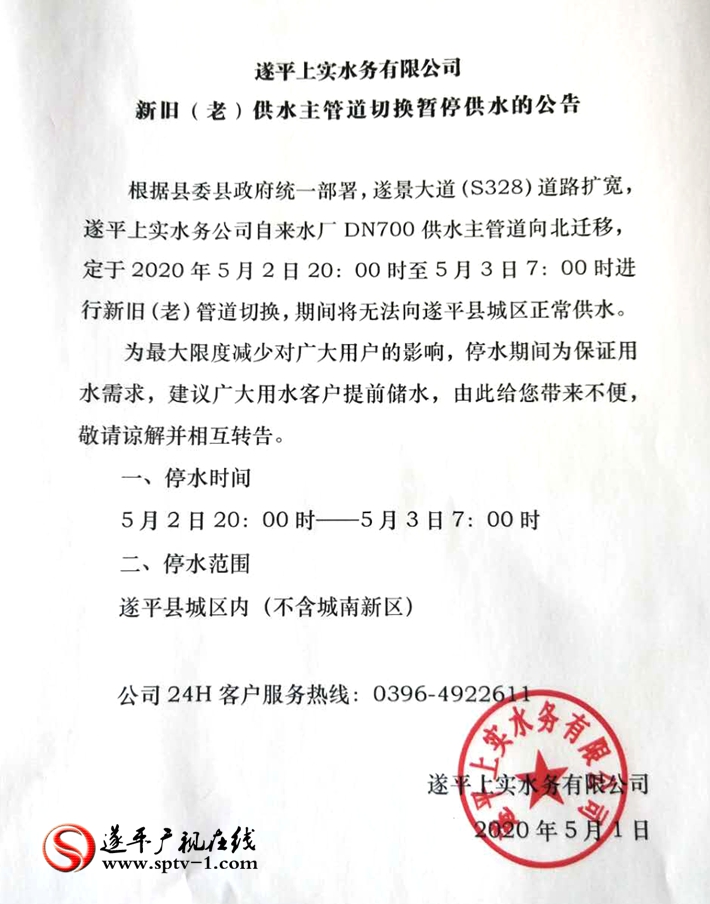 根据县委县政府统一部署,遂景大道(S328)道路扩宽, 遂平上实水务公司自来水厂 DN700 供水主管道向北迁移, 定于 2020 年 5 月 2 日 20:00 时至 5 月 3 日 7:00 时进 行新旧(老)管道切换,期间将无法向遂平县城区正常供水。