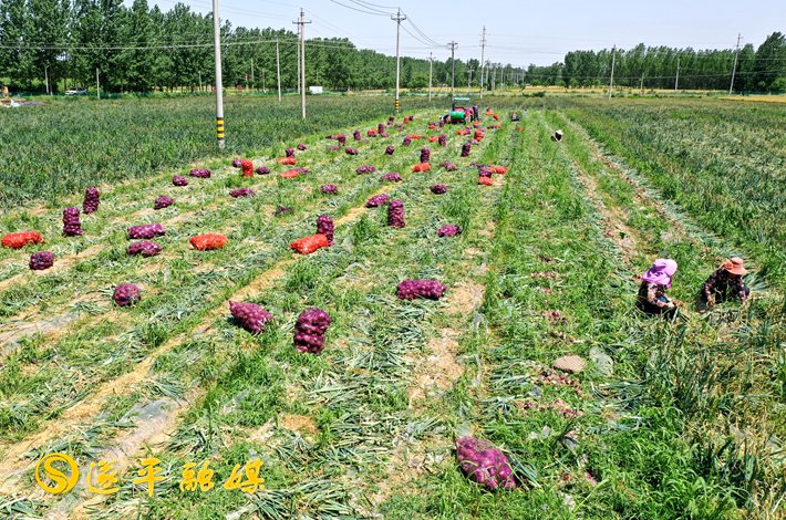 银乃群原本在新疆做生意,一年到头走南闯北,虽然赚了一些钱,但他心里始终挂念着家乡和亲人。经过几番考察对比,银乃群最终选定在家乡发展特色种植。2016年,银乃群开始引进洋葱在家乡周楼村尝试种植,当年恰逢产量高,市场行情又走高,当年他就尝到了甜头。2019年,他又流转土地100多亩扩大了洋葱种植规模。近日,记者在他的洋葱种植基地看到,工人们正在采挖洋葱,装袋称重。