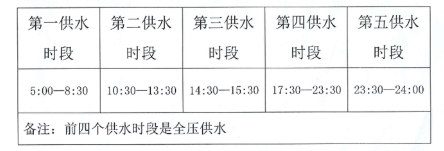随着夏季用水高峰期的到来,水源地供水产能不足与县城老百姓用水量增大的供需矛盾日益突出,我司为了缓解城区百姓用水紧张的局面,为了合理利用有限的水源,经商讨研究后决定,自6月5日起暂时性调整供水时间,具体供水时间如下表: