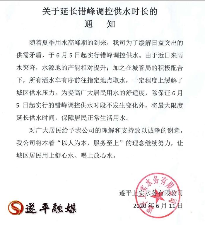 随着夏季用水高峰期的到来,我司为了缓解日益突出的供需矛盾,于6月5日起实行错峰调控供水。由于近日来雨水突降,水源地的产能相对提升,加之在城管局的积极配合下,所有洒水车有序前往指定地点取水,一定程度上缓解了城区供水压力。为提高广大居民用水的舒适度,除保证6月5日起实行的错峰调控供水时段不发生变化外,将最大限度延长供水时间,保障居民正常生活用水。