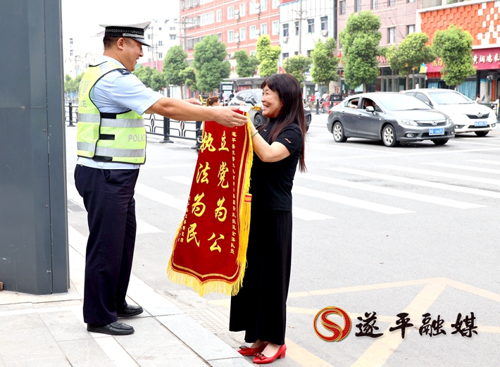 本网讯 近日,在遂平县嵖岈山路和灈阳大道交叉口附近出现了暖心的一幕,遂平县居民王女士将一面印有“立党为公 执法为民”的锦旗送到遂平县交警大队城区中队南岗民警陈国安的手中,对其工作表示感谢和认可。