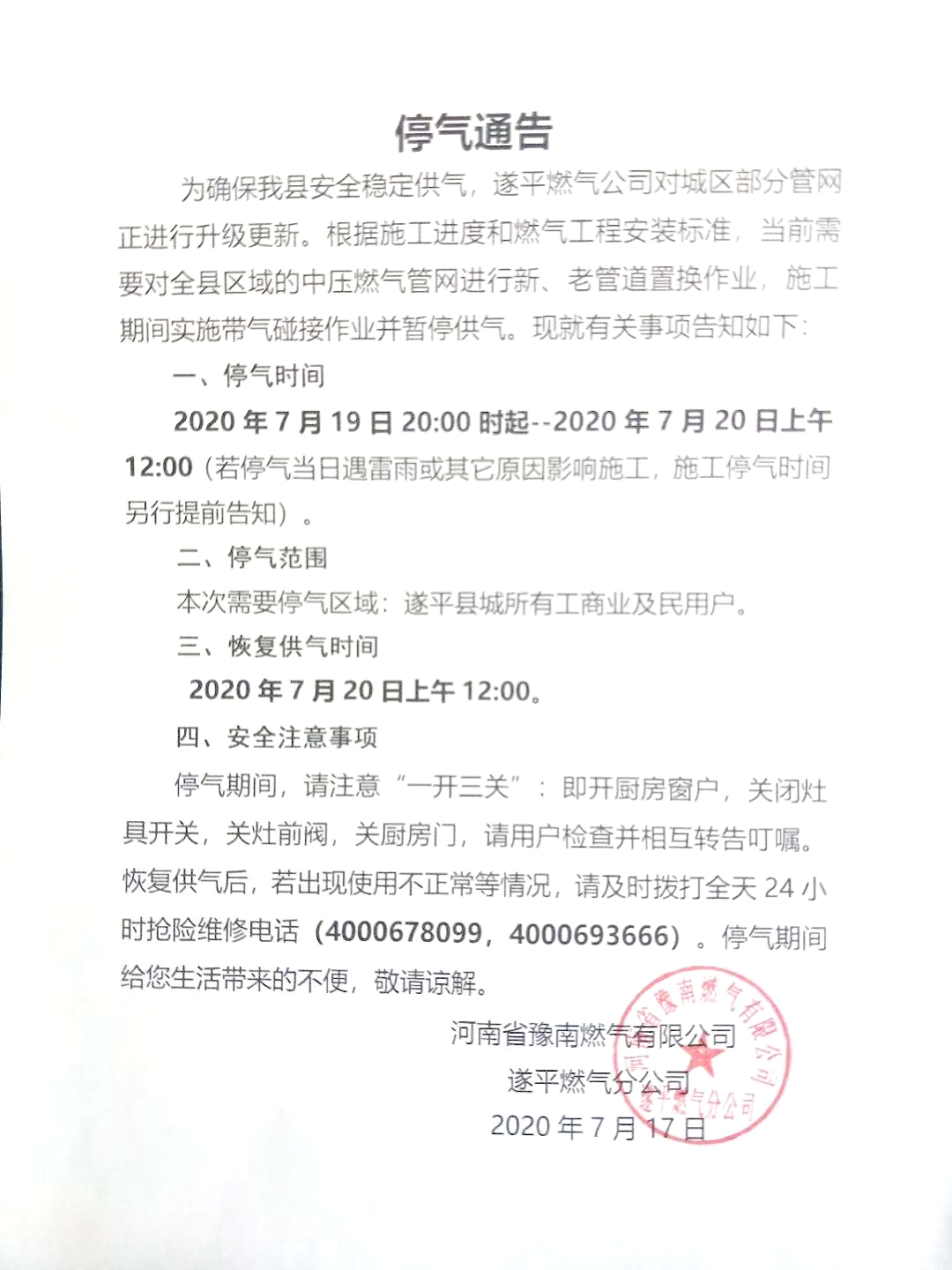 2020年7月19日20:00时起--2020年7月20日上午9:30(若停气当日遇雷雨或其它原因影响施工,施工停气时间另行提前告知)。