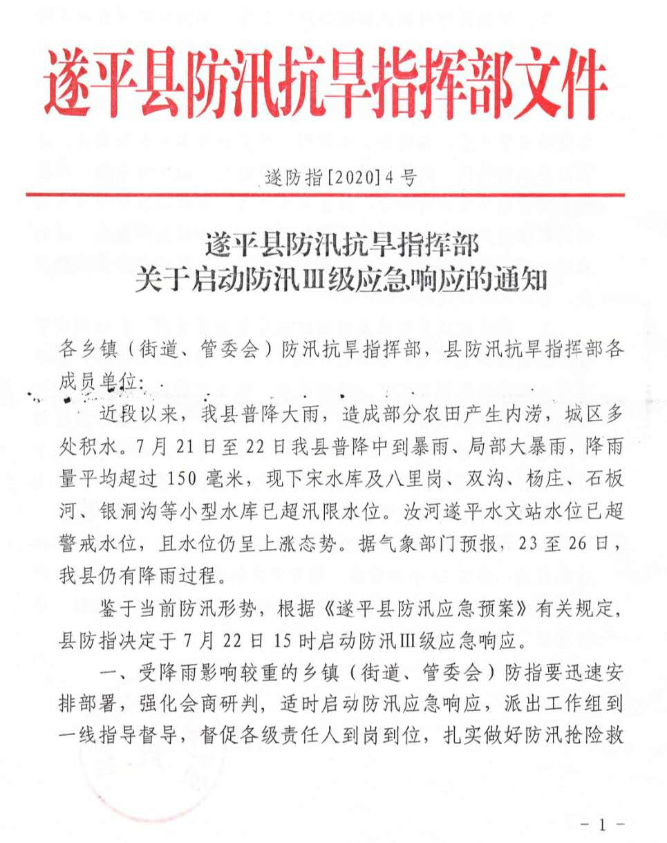 鉴于当前防汛形势,根据《遂平县防汛应急预案》有关规定,县防指决定于7月22日15时启动防汛Ⅲ级应急响应。