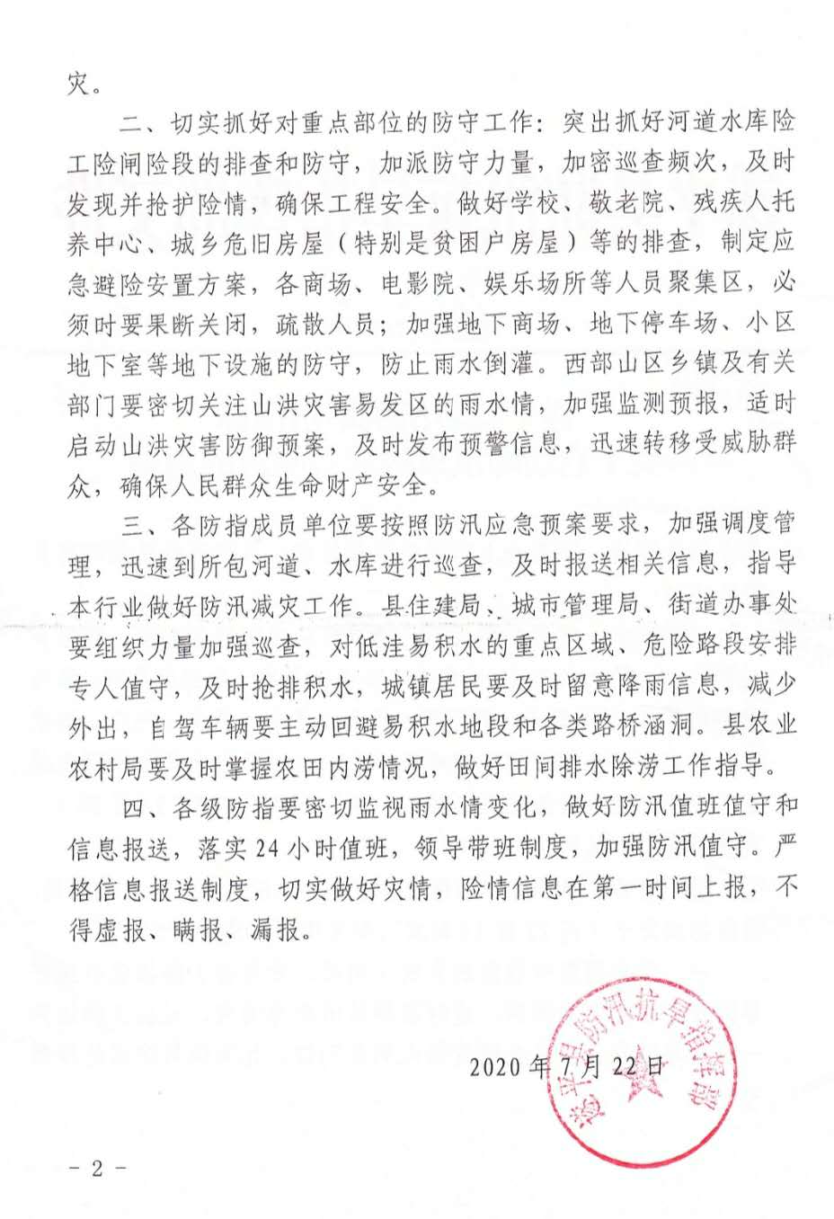 二、切实抓好对重点部位的防守工作:突出抓好河道水库险工险闸险段的排查和防守,加派防守力量,加密巡查频次,及时发现并抢护险情,确保工程安全。做好学校、敬老院、残疾人托养中心、城乡危旧房屋(特别是贫困户房屋)等的排查,制定应急避险安置方案,各商场、电影院、娱乐场所等人员聚集区,必须时要果断关闭,疏散人员;加强地下商场、地下停车场、小区地下室等地下设施的防守,防止雨水倒灌。西部山区乡镇及有关部门要密切关注山洪灾害易发区的雨水情,加强监测预报,适时启动山洪灾害防御预案,及时发布预警信息,迅速转移受威胁群众,确保人民群众生命财产安全。