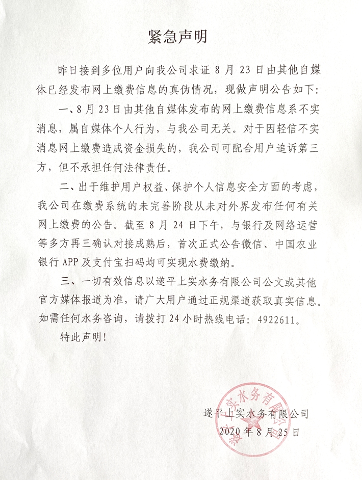一、8月23日由其他自媒体发布的网上缴费信息系不实消息,属自媒体个人行为,与我公司无关。对于因轻信不实消息网上缴费造成资金损失的,我公司可配合用户追诉第三方,但不承担任何法律责任。