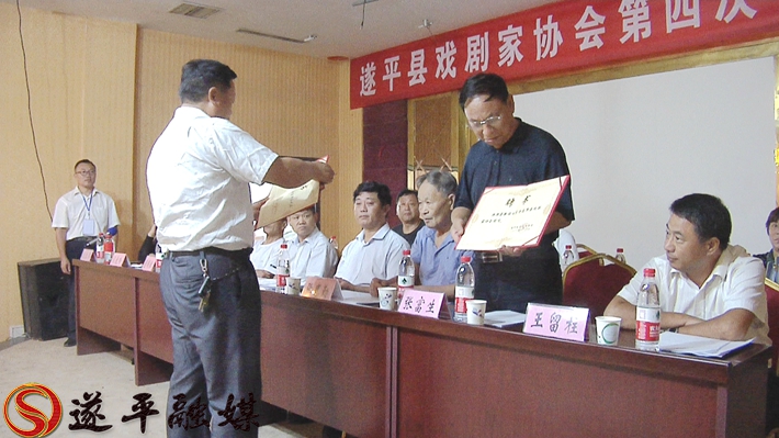 新当选的县剧协主席牛清河向遂平县戏剧协会名誉主席、顾问颁发了聘书。
