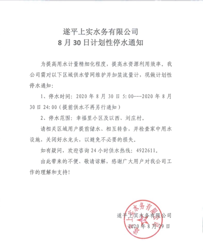 8月30日计划性停水通知