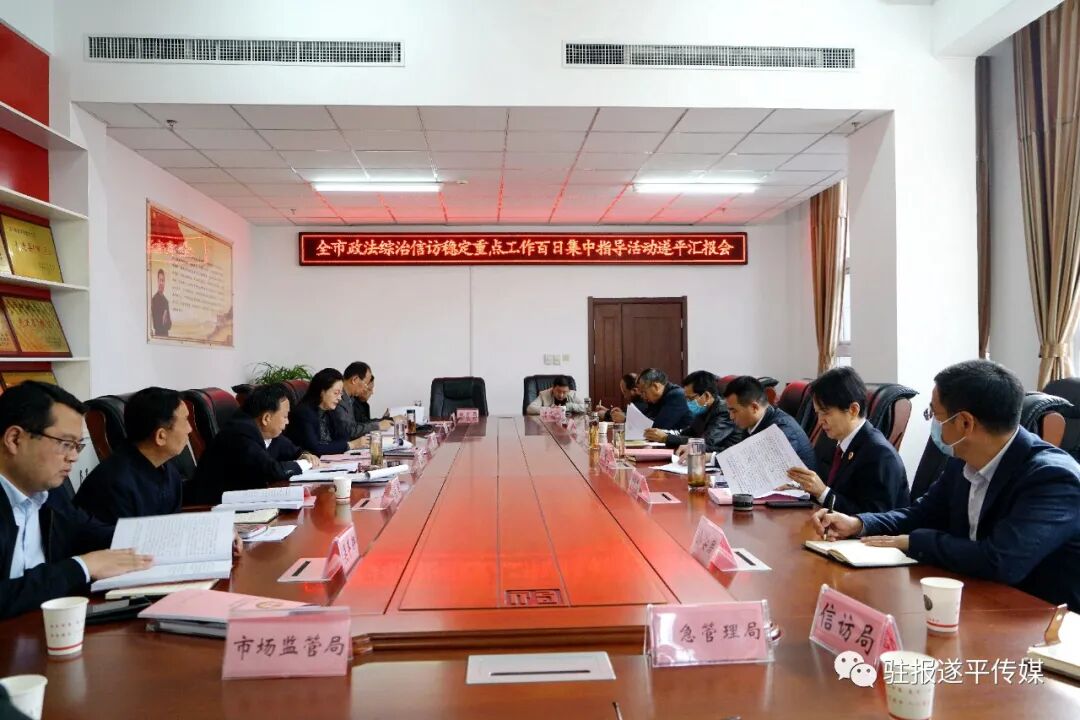 遂平县委常委、县委政法委书记戚斌出席并汇报遂平县政法综治信访稳定重点工作开展情况,县公、检、法、司负责人及部分县直有关单位人员参加汇报会。