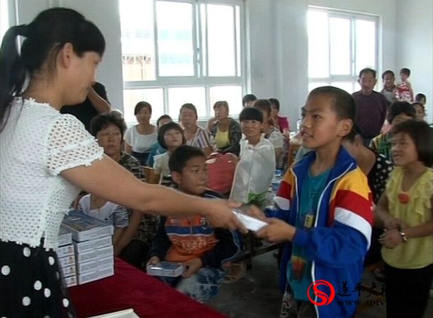 上图:爱心企业工作人员把助听器发在每一位听障孩子的手中。