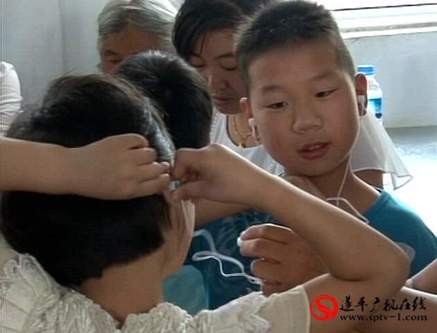 上图:爱心企业工作人员教听障孩子佩戴助听器发。