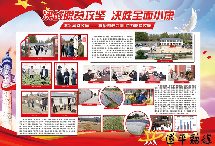 遂平县财政局在县委、县政府的坚强领导下,全面落实中央、省、市、县脱贫攻坚部署要求,提高政治站位,强化工作措施,扶贫项目资金监管服务、驻村帮扶工作取得显著成效。2019年被驻马店市委、市政府表彰为全市脱贫攻坚先进单位,2017年、2018年、2019年被县委、县政府表彰为全县脱贫攻坚先进单位,先后5人次被表彰为市级县级脱贫攻坚先进个人。2017年3月以来,遂平县财政局派驻褚堂街道周楼村、八里刘社村、小王庄村驻村工作队开展驻村帮扶工作,工作队强化机制建设,狠抓责任落实、政策落实和工作落实,扎实有效推进脱贫攻坚,取得了阶段性成效。