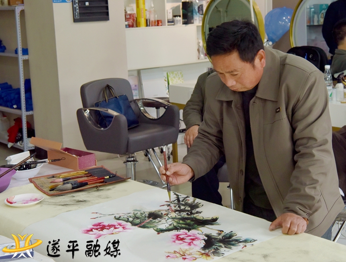 在“艺丝枫尚”美发店,书画家们现场挥毫泼墨进行书画创作,送上浓浓的墨香、深深的祝福。
