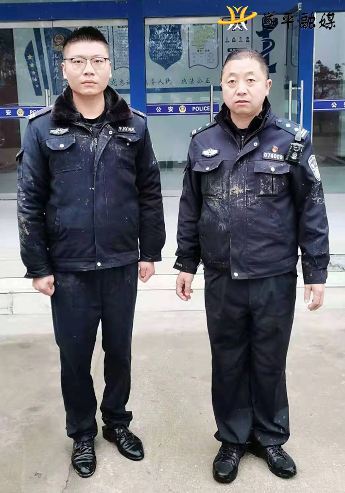(为救人跳入河中中浑身湿透的民警杜永营、李鹏飞)