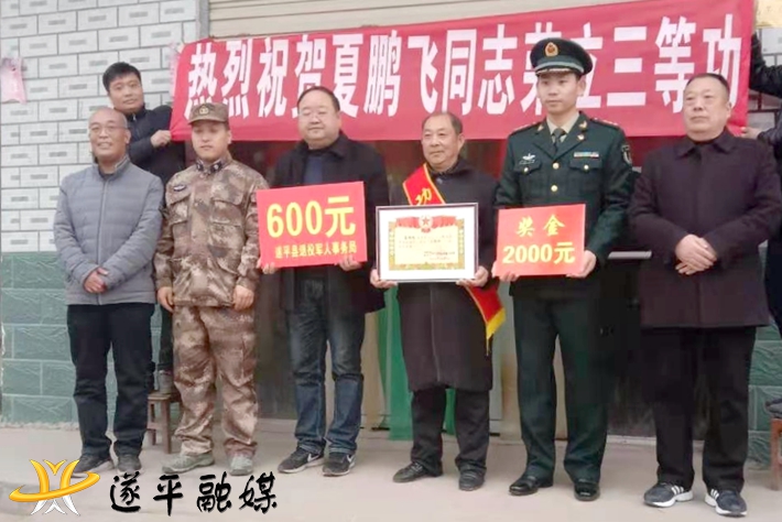 12月31日下午,在收到夏鹏飞所在部队相关领导的联系电话后,遂平县人武部领导高度重视,立即协调遂平县退役军人事务局和莲花湖街道武装部进行筹划。1月4日下午,遂平县人武部、退役军人事务局和莲花湖武装部一行人来到夏鹏飞家中,在父老乡亲的见证下,庄严宣读了夏鹏飞同志立功通令,并向其父母送上了立功喜报和奖金。