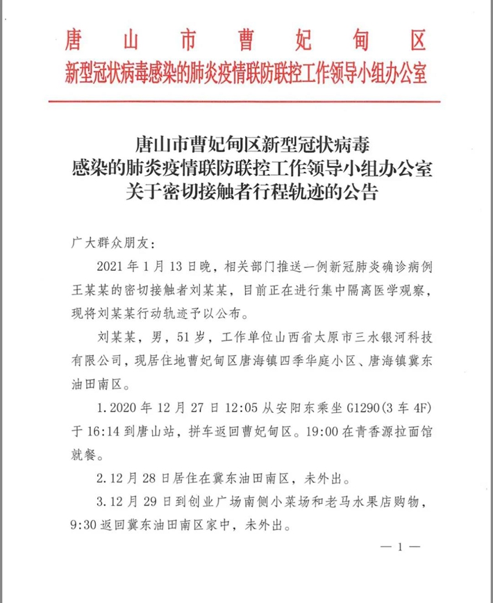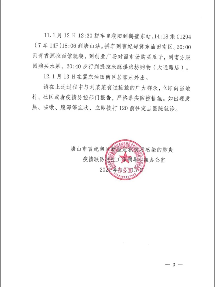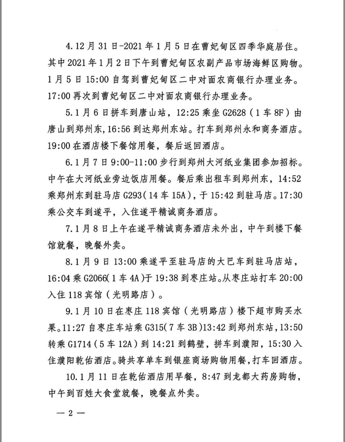 4、12月31日-2021年1月5日在曹妃甸区四季华庭居住。其中2021年1月2日下午到曹妃甸区农副产品市场海鲜区购物。1月5日15:00自驾到曹妃甸区二中对面农商银行办理业务。17:00再次到曹妃甸区二中对面农商银行办理业务。