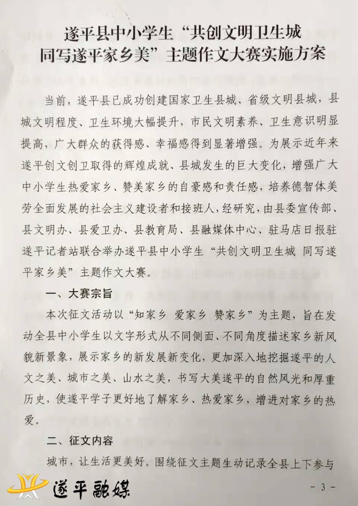 当前,遂平县已成功创建国家卫生县城、省级文明县城,县城文明程度、卫生环境大幅提升,市民文明素养、卫生意识明显提高,广大群众的获得感、幸福感得到显著增强。为展示近年来遂平创文创卫取得的辉煌成就、县城发生的巨大变化,增强广大中小学生热爱家乡、赞美家乡的自豪感和责任感,培养德智体美劳全面发展的社会主义建设者和接班人,经研究,由县委宣传部、县文明办、县爱卫办、县教育局、县融媒体中心、驻马店日报驻遂平记者站联合举办遂平县中小学生“共创文明卫生城 同写遂平家乡美”主题作文大赛。