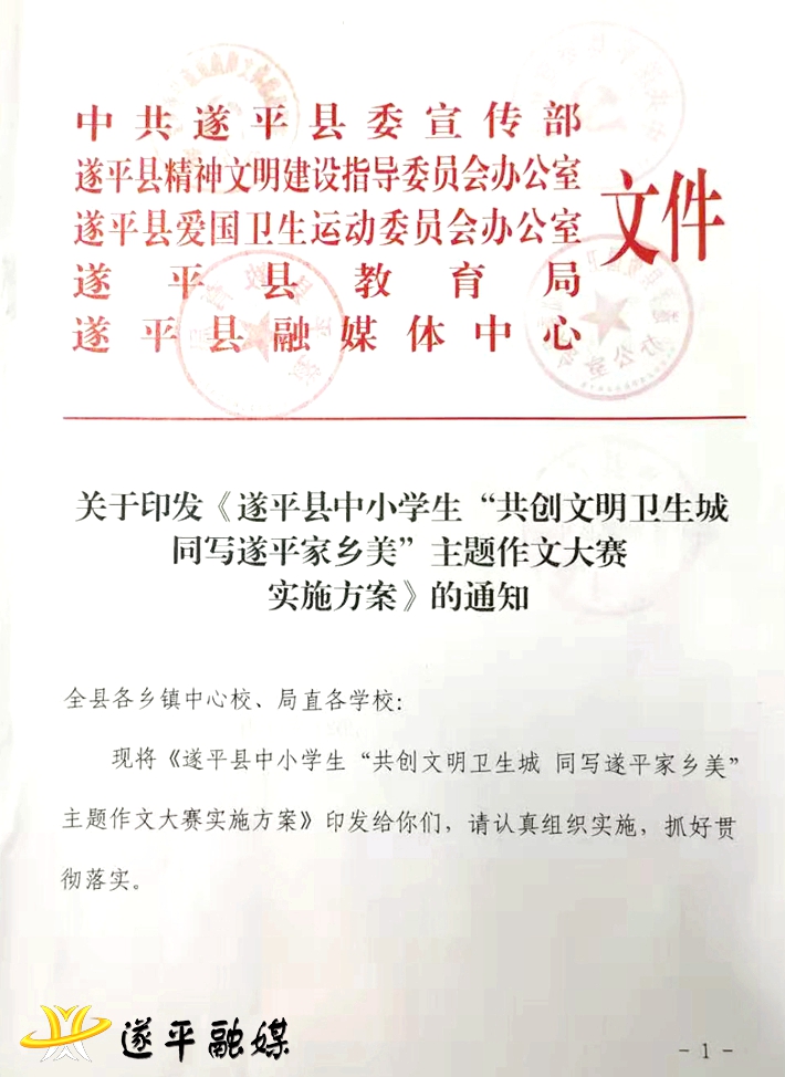 现将《遂平县中小学生“共创文明卫生城 同写遂平家乡美”主题作文大赛实施方案》印发给你们,请认真组织实施,抓好贯彻落实。