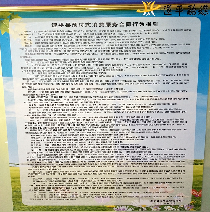 在此,遂平县市场监督管理局提醒广大消费者慎选商家、理性办卡,共同抵制不法经营行为,杜绝“霸王条款”、行业 "潜规则"的出现。