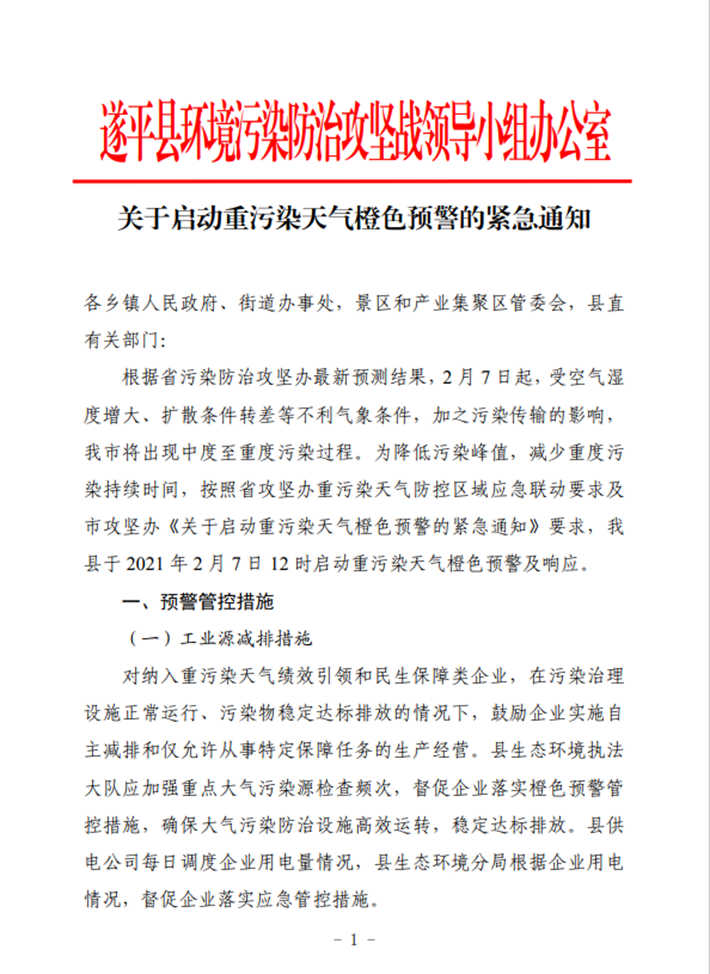 根据省污染防治攻坚办最新预测结果,2月7日起,受空气湿度增大、扩散条件转差等不利气象条件,加之污染传输的影响,我市将出现中度至重度污染过程。为降低污染峰值,减少重度污染持续时间,按照省攻坚办重污染天气防控区域应急联动要求及市攻坚办《关于启动重污染天气橙色预警的紧急通知》要求,我县于2021年2月7日12时启动重污染天气橙色预警及响应。