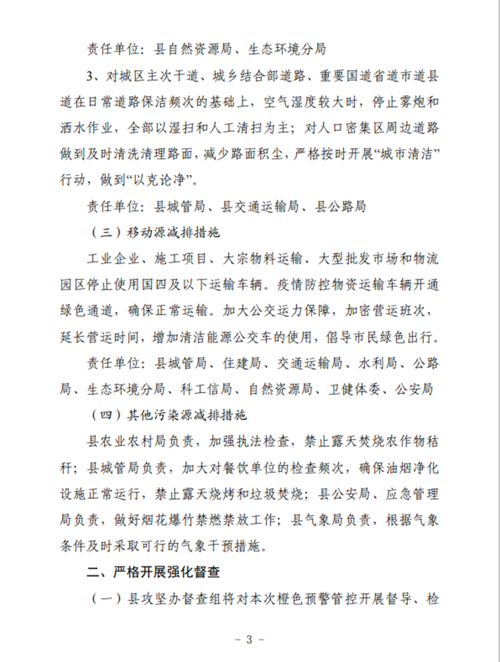 县农业农村局负责,加强执法检查,禁止露天焚烧农作物秸秆;县城管局负责,加大对餐饮单位的检查频次,确保油烟净化设施正常运行,禁止露天烧烤和垃圾焚烧;县公安局、应急管理局负责,做好烟花爆竹禁燃禁放工作;县气象局负责,根据气象条件及时采取可行的气象干预措施。