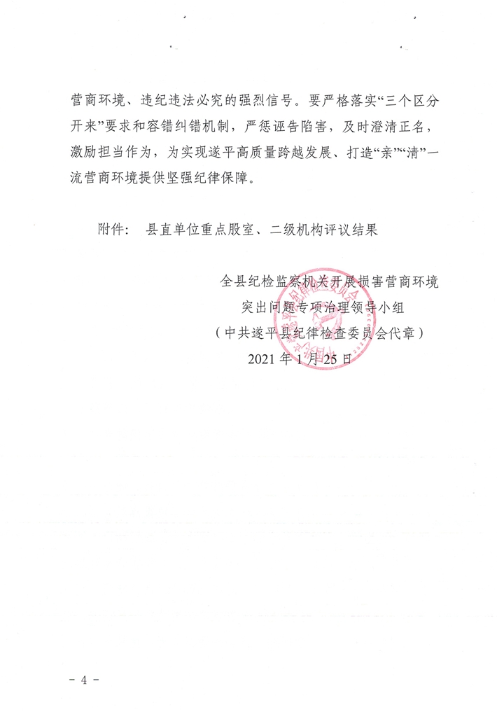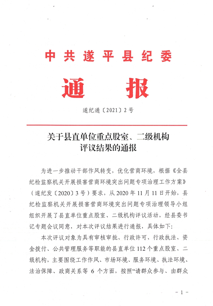 为进一步推动干部作风转变,优化营商环境,根据《全县纪检监察机关开展损害营商环境突出问题专项治理工作方案》(遂纪发〔2020〕3号)要求,从2020年11月11日开始,县纪检监察机关开展损害营商环境突出问题专项治理领导小组组织开展了县直单位重点股室、二级机构评议活动,经县委书记专题会议同意,对本次评议结果进行通报,具体如下: