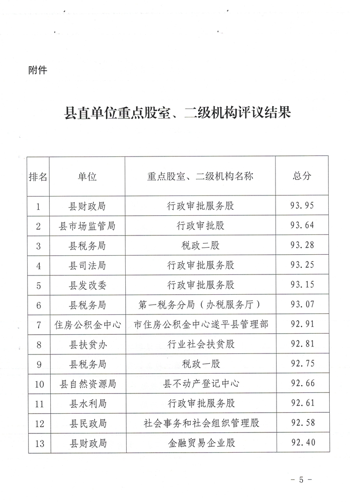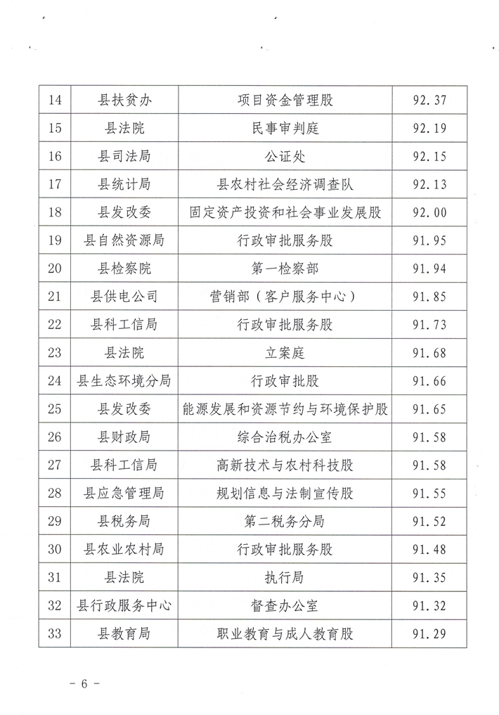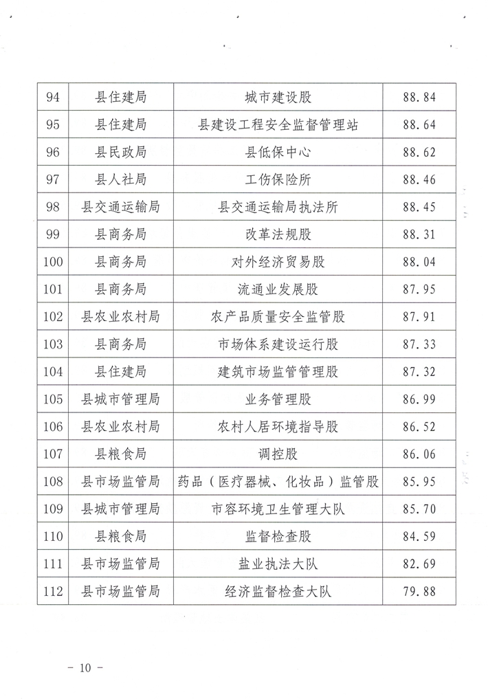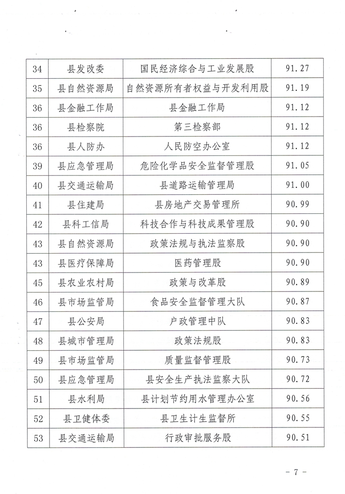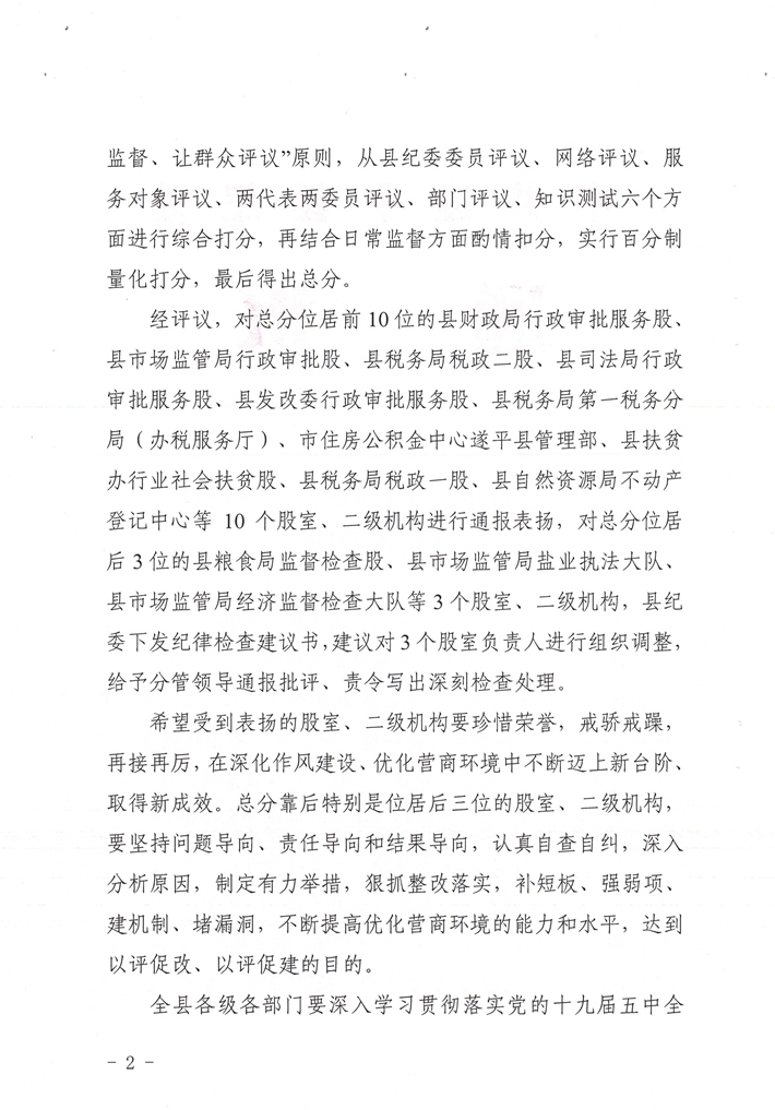经评议,对总分位居前10位的县财政局行政审批服务股、县市场监管局行政审批股、县税务局税政二股、县司法局行政审批服务股、县发改委行政审批服务股、县税务局第一税务分局(办税服务厅)、市住房公积金中心遂平县管理部、县扶贫办行业社会扶贫股、县税务局税政一股、县自然资源局不动产登记中心等10个股室、二级机构进行通报表扬,对总分位居后3位的县粮食局监督检查股、县市场监管局盐业执法大队、县市场监管局经济监督检查大队等3个股室、二级机构,县纪委下发纪律检查建议书,建议对3个股室负责人进行组织调整,给予分管领导通报批评、责令写出深刻检查处理。