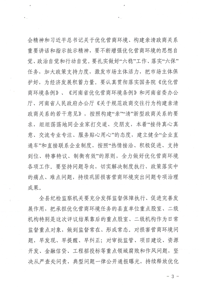 全县各级各部门要深入学习贯彻落实党的十九届五中全会精神和习近平总书记关于优化营商环境、构建亲清政商关系重要讲话和指示批示精神,要不断增强优化营商环境的思想自觉、政治自觉和行动自觉。要扎实做好“六稳”工作、落实“六保”任务,加大政策支持力度,激发市场主体活力,把市场主体保护好,为经济发展积蓄力量。要认真贯彻落实国务院《优化营商环境条例》、《河南省优化营商环境条例》和河南省委办公厅、河南省人民政府办公厅《关于规范政商交往行为构建亲清政商关系的若干意见》,按照构建“亲”“清”新型政商关系的要求,坦坦荡荡地同企业家打交道、交朋友,本着“接待真心真意、交流专业专注、服务贴心用心”的态度,建立健全“企业直通车”和直接联系企业制度,按照“热情接洽、积极促进、支持到位、特事特议、制衡有效”的原则,全力做好优化营商环境各项工作。要坚持问题导向,切实解决制度执行、政策落实中的痛点、难点问题,持续巩固损害营商环境突出问题专项治理成果。